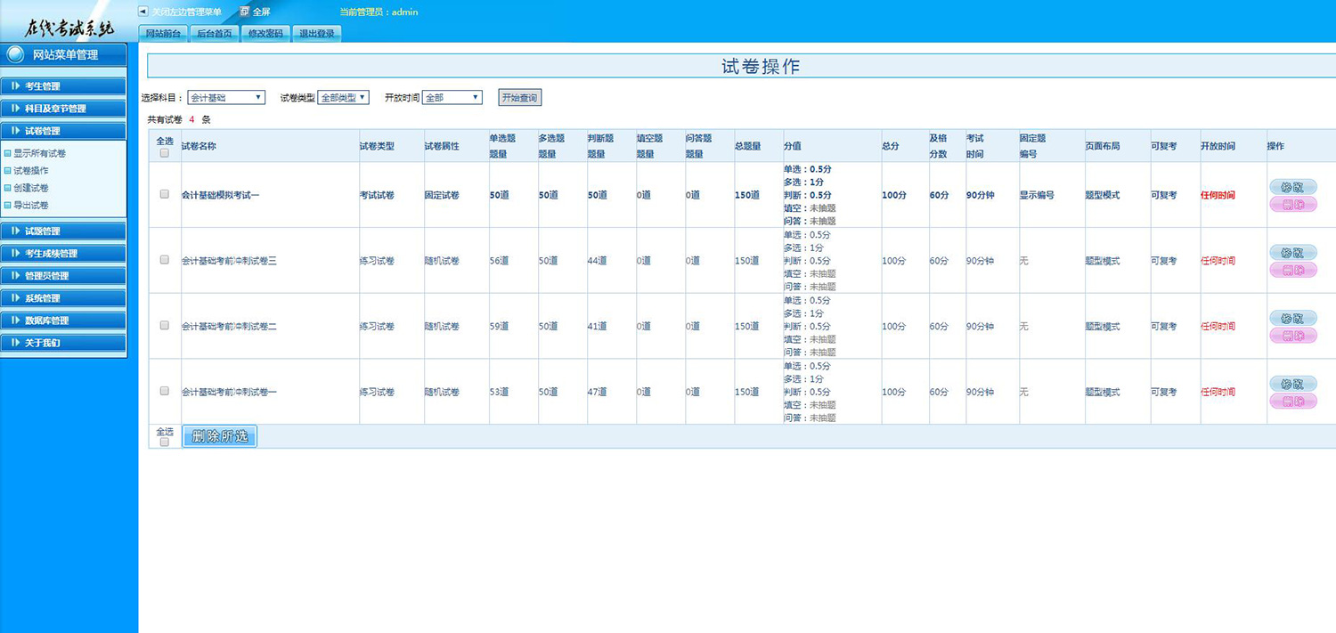 隨機組卷:此組卷方式在組卷時需要指定單選、多選及判斷時需要抽取的題數(shù),在考試時每個學生的試題內(nèi)容及順序不相同,但總題數(shù)是相同的,且都屬于同一科目。